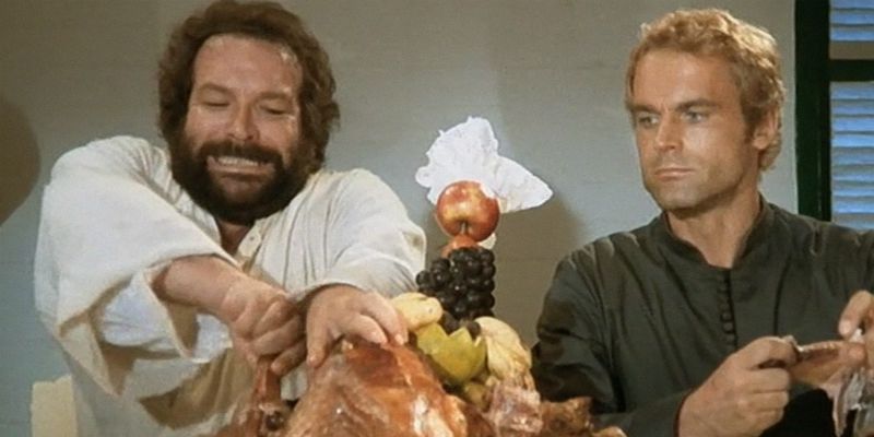 Anno dopo anno, il filone degli spaghetti western si avvicinava al suo esaurimento, ma ancora nel 1974 Spencer e Hill - che pure avevano iniziato a girare film d’ambientazione contemporanea - riuscivano a farci ridere con un film d’ambientazione d’epoca che non era propriamente un western, ma che gli andava vicino: Porgi l'altra guancia, diretto da Franco Rossi a partire da un soggetto di Rodolfo Sonego, in cui Bud e Terence vestivano i panni di due improbabili missionari che, in qualche luogo dell’America Centrale, proteggevano la popolazione locale e i loro confratelli dal tirranno di zona a suon di sganassoni. Ovviamente.