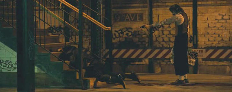 33° minuto. Nel treno della metro Arthur Fleck subisce l'aggressione di tre molesti dipendenti della Wayne Enterprises e usa per la prima volta la pistola che gli aveva dato il suo collega clown. Uno dei tre lo finisce sulle scale uscendo dalla stazione della 9ª Avenue.